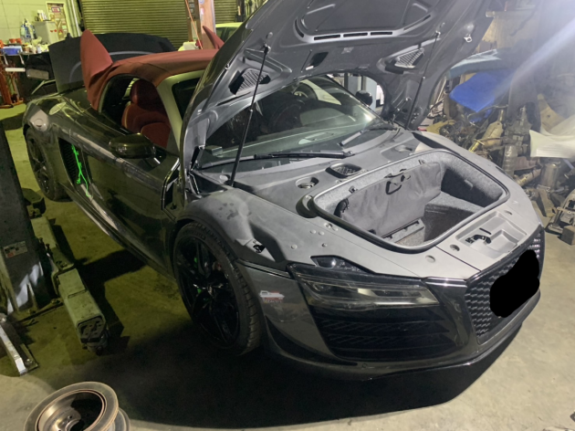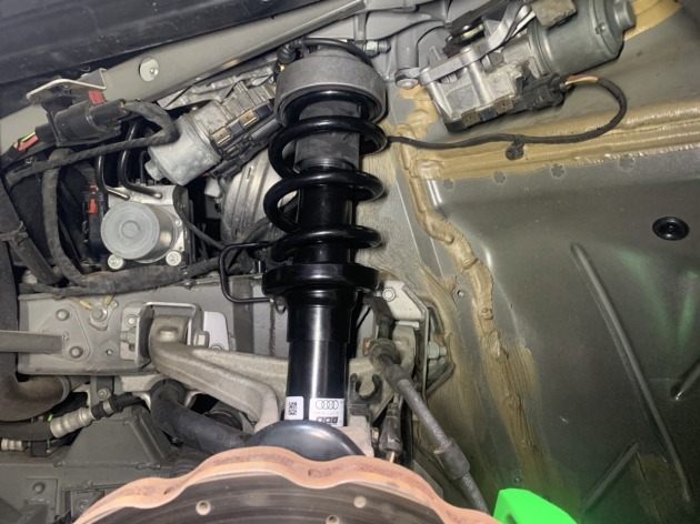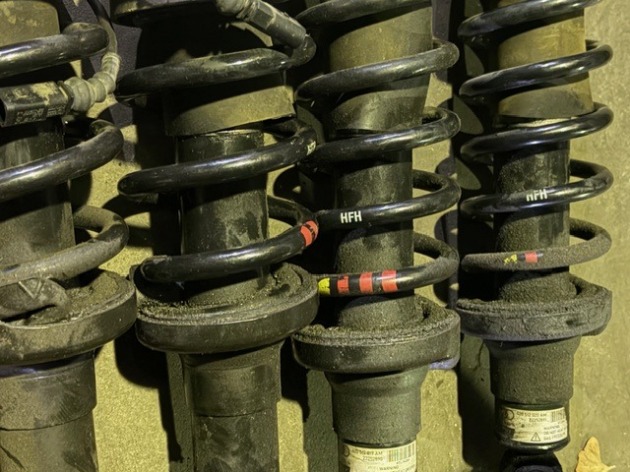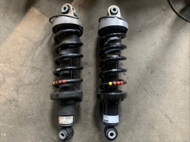 アウディR8では定番のショックアブソーバーからのオイル漏れらしいですが、4本ともオイル漏れが酷く、車庫も下がっていました…