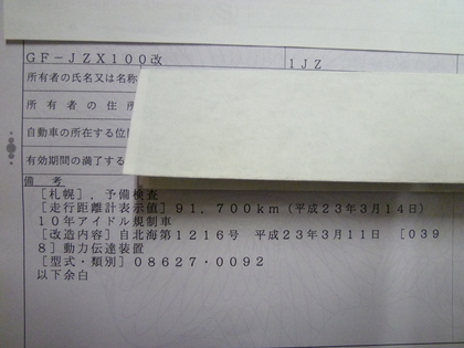 チェイサー ツアラーV JZX100 AT→MTスワップ車輌の公認車検完了! 2011年3月17日 先日W様にご購入頂いた チェイサーツアラーV フルエアロ の公認車検が終わりました!当社にてAT→MTスワップした車輌なので公認車検を取得いたしました!