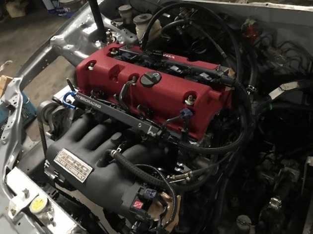 プロインテーク製サージタンク、Skunk2製ビッグスロットル、ハイブリッドレーシング製フューエルデリバリー、ORC製クラッチなどを取り付けて搭載しました。