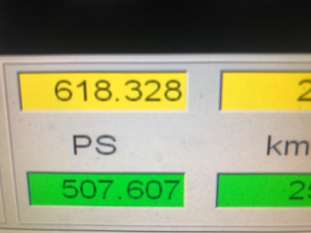 前回はノーマル触媒の詰まりや純正のブーストソレノイドバルブの故障で507馬力でしたので、今回の作業やセッティングで110馬力アップしました。