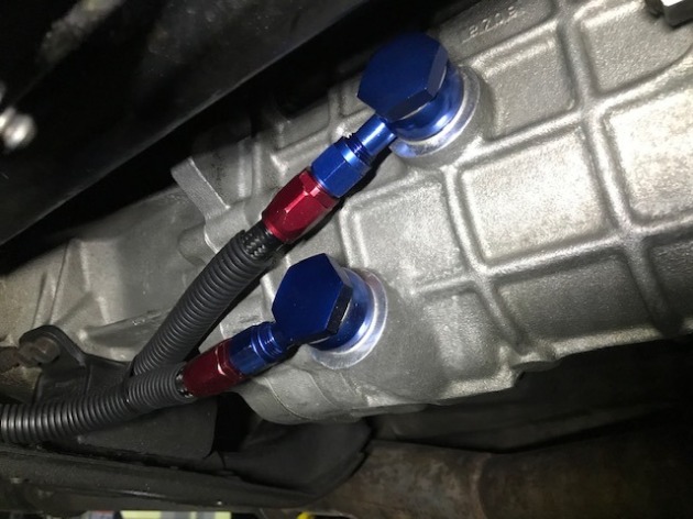 オイルクーラーの取り出しはドレンボルト穴を利用してIN・OUTにバンジョーボルトを使用してホースをジョイントしました。