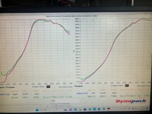 パワー569.7PS、トルク64.3kgm出ました!!