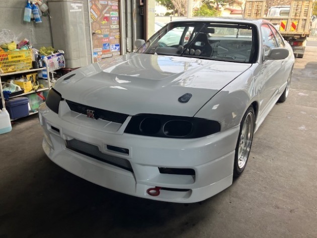 隊長の33GT-Rですが、最後の仕上げでエアロパーツを取り付けました! GPスポーツフロントバンパースポイラー&純正グリル&ガレージアクティブ牽引フック セレスティア超軽量FRPレーシングレーンホース