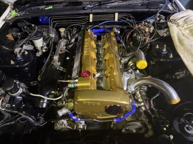 エンジンルームもキレイに塗装したので、慎重にエンジンを搭載した後に、キャンディゴールドに塗装したカバー類に交換しました。