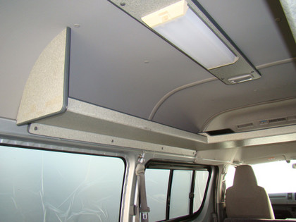 足元スッキリ!頭上収納できるセンター&サイドトレー :中古車「ハイエース ロングハイルーフDX」