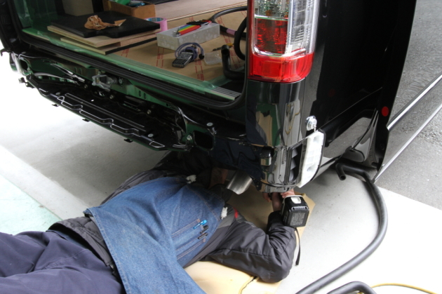 車の下回りをチェックして取り付け位置を確認します。