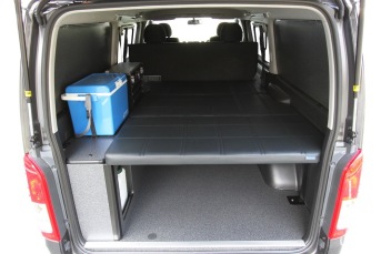 セカンドシートはそのまま利用して、スライドレールを床面に埋め込みました。前後へと大きくスライドが出来るため友達を乗せたまま荷物やバイクの積載が可能です。