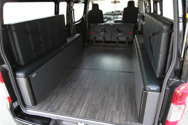 今回オーダーで施工を施したのは荷室スペースに設置した脱着のできるフラットベッドです。ベッド下にはボディボードの大会や練習の際に持っていくバケツやクーラーボックスなどが積載できることが必須です。一番高さのあるバケツが積載できるようにオーダーで高さを調整しています。