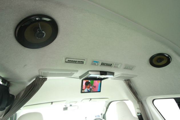 セカンドシートの周辺にはスピーカーが無いため、スピーカーを増設しフリップダウンモニターも装備しました。お子様がセカンドシートに座って長距離移動する際にも楽しんでいただけます。