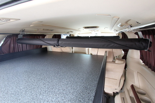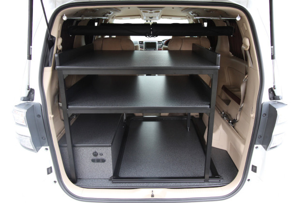 どのサイズの車輌もご家族と一緒にゲレンデに向かって一緒に楽しむことのできるお車になっています。そのため、家族でゆったりと車中泊ができるベッドスペースを確保しスノーボードの収納ができるベッド下の空間やラックを取り付けさせていただいています。