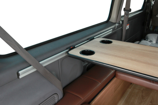 テーブルのカラーは内装色に合わせたオーダーカラーで仕上げています。テーブルのカラーを車内と同じカラーにすることでより落ち着くことのできる空間となります。