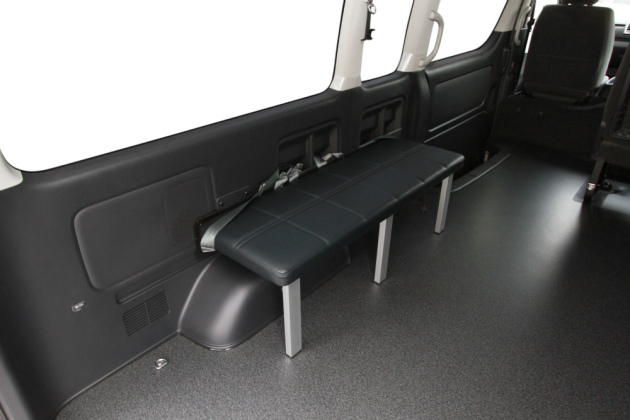 両サイドに収納したシートを展開する事で大人が横向きで6人座ることのできるスペースを確保しています。もちろん、バイクのブーツを履く際や休憩する時に使用できるように展開方法は簡単です。