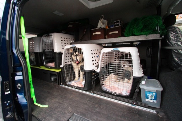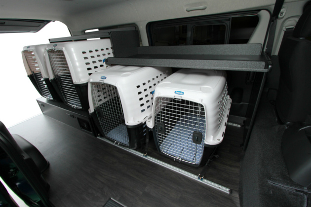 大型のワンちゃんが4頭乗車できるように、ケージを4個設置しました。移動中にケージが動いてワンちゃんが酔ってしまわないようにベルトでケージが固定できるようになっています。ワンタッチレールを使用している為、ケージの設置場所に合わせて自由に動かしていただけます。