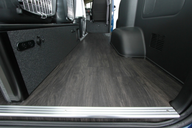 車内に装備された純正のセカンドシートを取り外し、全面にSH床貼り加工を施しました。人に比べ足の小さなワンちゃんが、足を取られずストレスなく車内を歩いていただけます。もちろん、2人乗りに構造変更を行った公認車輌です。