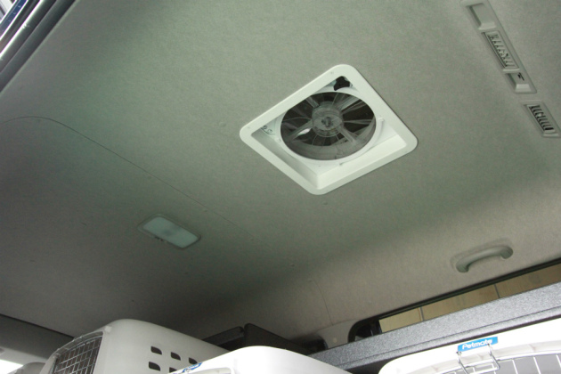 天井にはMAXファン(ベンチレーター)を取り付けました。天井にあることで車内全体の熱い空気や臭いまんべんなく排出されます。排気口は進行方向と逆を向いているため、走行中であっても使用していただく事が可能です。ま