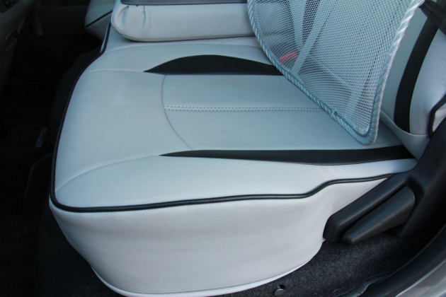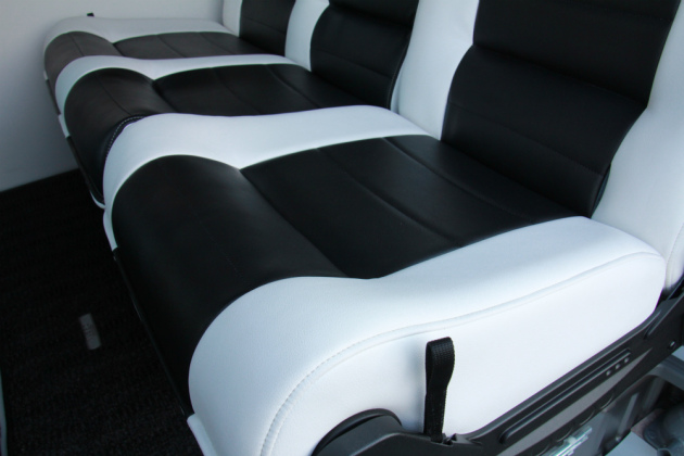 車輌入庫時から、フロントシートに装備されていたシートカバーの色に近い色でセカンドシートのカラーも製作しました。お客様のご希望でカラーの配色をおこない、黒が主張しすぎない清潔感のあるイメージに変化しました。
