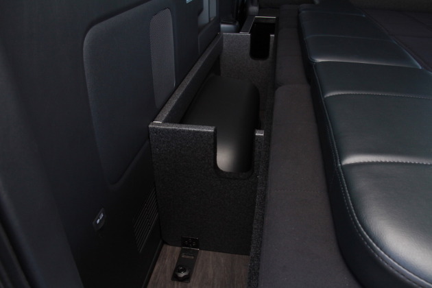 車内の床には全面がフラットになるSH床貼り加工を施させていただきました。黒木目のポンリュームが車内を落ち着いたイメージにしています。
