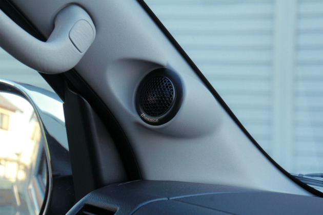 Dピラーには純正で装備されていないスピーカーを装備しました。ジェイクラブ製のレガンスDピラースピーカーです。