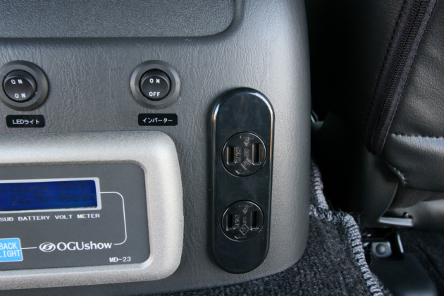 車内に装備したSHサブバッテリーシステム。メインバッテリーとサブバッテリーの電圧状態が分かるメーターをはじめ、電装装備をセンターコンソールに加工を加えて取付けしました。