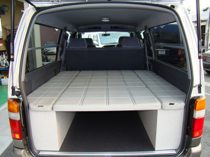 中古車「平成15年式ハイエース ロングS-GL」のベッドはオグショー製「フラットベッド」が