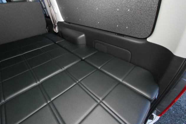 ベッドの広さはそのままになっており、車内いっぱいの幅に約1800mmの長さを確保したベッドになっています。大人がゆっくりを足を伸ばして休んでいただけます。もちろん、高さのある荷物を積載する時にはベッドマットを取り外していただけます。