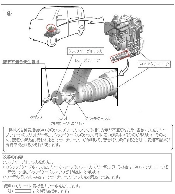 ④機械式自動変速機(AGS)のクラッチケーブルアンカの組付指示が不適切なため、当該アンカとレリーズフォークのスリットが一致し、クラッチケーブルのクランプ部に応力が集中するものがあります。そのため、変速が繰り返し行われると、クラッチケーブルが破断して、警告灯が点灯するとともに、変速不能及び走行不能となるおそれがあります。