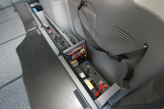 サブバッテリーは、荷室スペースのボックスの中に取り付けさせていただきました。これで、車内の場所をとってしまう事無く広く積載スペースを使用していただけます。