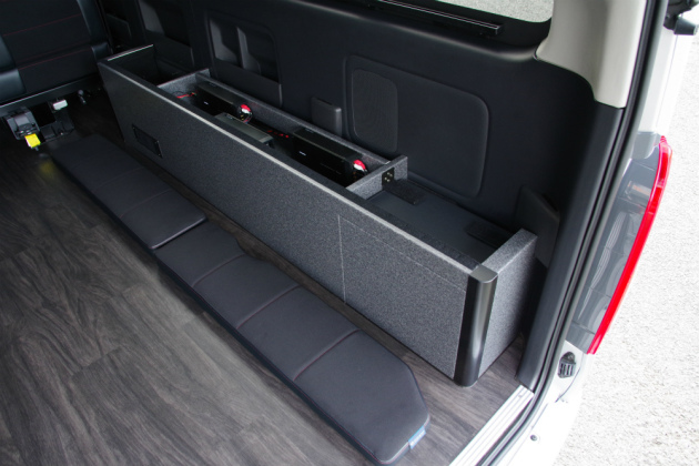 ベッドボックスの中に装備したのは、ウーファーです。今回こちらの車輌を作るにあたってメーカーに依頼してベッドボックスに入るように製作していただいたそうです。