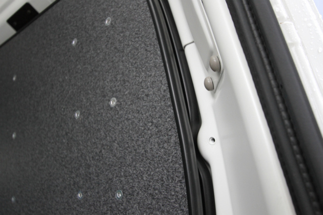 フルオーダーでウィンドウパネルを製作したため、通常純正のユーティリティナットを利用して固定している箇所もビスで固定させていただいています。なお、今回の車輌には窓の開け閉めができる小窓が装備されていたため板を2枚重ねる作りになっています。