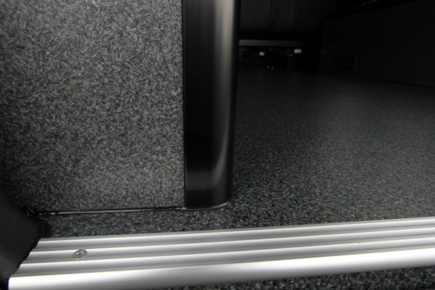 出し入れの多いリアゲートのエンドには、アルミのノンスリップが取り付けられています。さらに、雪などで錆びてしまわないように錆びにくいステンレスのビスを利用してノンスリップを固定しています。