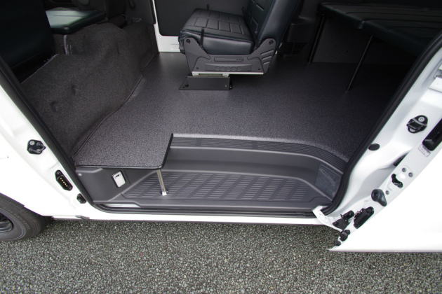 車内の床は、SH床貼り加工が施され雪で濡れたブーツやウェアのまま乗り込んでも安心な仕上がりになっています。この床は、汚れに強く車内をお手入れする際には、濡れ雑巾があれば簡単に綺麗にしていただく事も可能です。