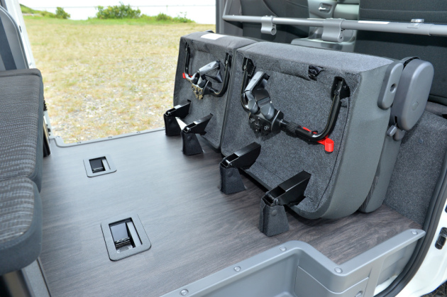 NV350キャラバントランスポーターには、床張り加工が標準で施されているぞ!そのため納車当日に、遊び道具を載せてトランポライフを始める事が可能だ!汚れに強いロンリュームが採用されているから手入れも簡単。