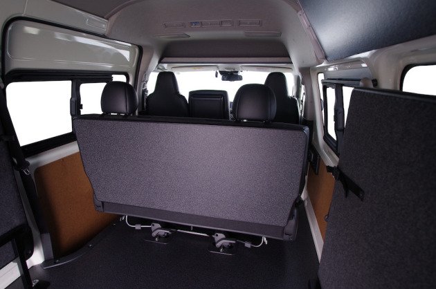 車内の荷室スペースには、ESウィンドウパネル、ESフリップテーブルを装着し、天井のサイドにはESフリップトレーを3個装着しています。