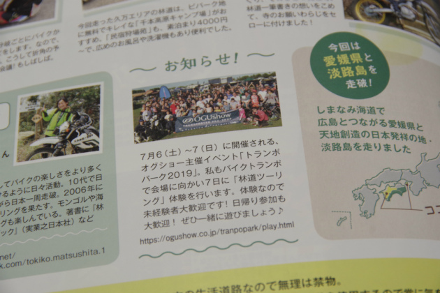 なお、来月オグショーで開催する「OGUshow Tranpo Park 2019」の紹介もして下さっています!このイベントでは、松下時子さんと一緒に林道を走る体験も開催しますので気になっている人は是非ご参加ください!