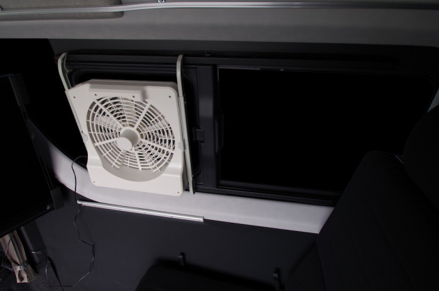 TVのすぐ近くには、FIAMMAのターボキットを純正の小窓に設置しました。これからの夏の季節には重宝するアイテムです。