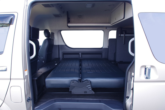 ベッドにして、荷台のベッドと繋げることで全面をベッドとして使えるシートをセカンドシートとして装備しました。