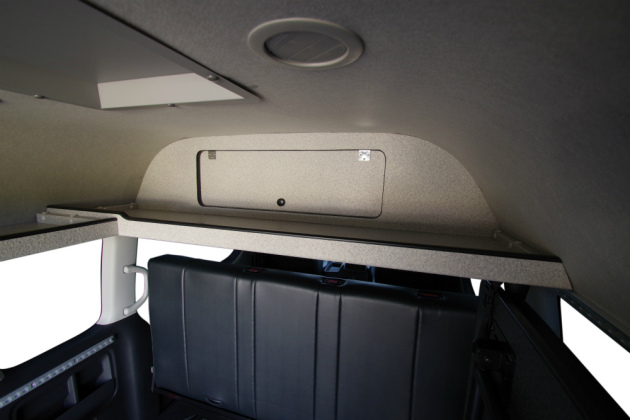約1600mmの天井高が確保されたハイルーフの車内。そんな、高い天井スペースにSHサイドトレー・SHセンタートレーを装着しました。トレーを装備したことで、レーシングカートのメンテナンスに使うケミカル類の収納からレーシングスーツやヘルメットまで載せておく事ができます。
