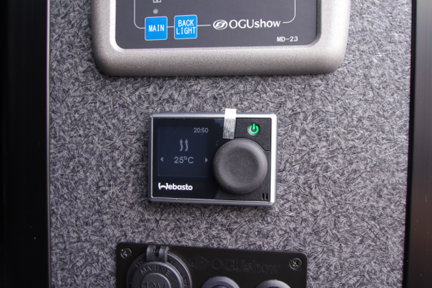 車内に装備されたサブバッテリーから電源を取っているため、エンジンを切った車内でもFFヒーターを起動して車中泊をしていただけます。