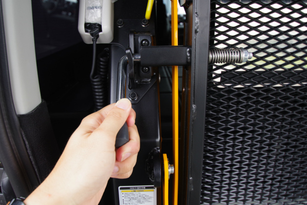 リフトは折りたたんで収納できる作りになっています。1段目は手前のスロープを持って折りたたみ、広げる時にはサイドのロックを解除してから展開します。