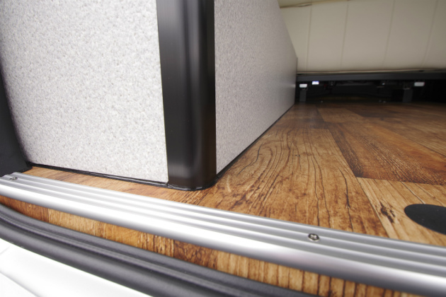 SH床貼り施工では、壁と床との間に防水処理としてシーリング加工を施しています。車内の作りでベッドボックスを製作した際には、ボックスと床との間にも防水処理を行います。