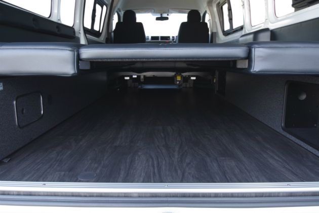 床には、SH床貼り加工を施しセカンドシートの足元から荷室まで全てに加工をしています。