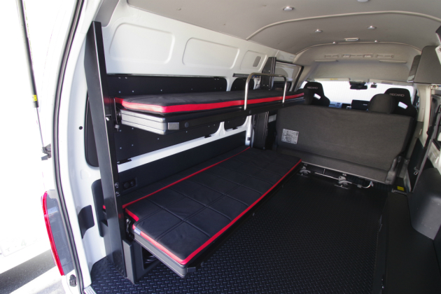 特注カラーで仕上げた2段ベッドをハイエースに装備