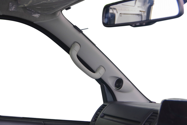 200系ハイエースのフロントシート前にあるAピラー。その箇所に純正カラーに近い樹脂を採用したAピラースピーカーを取り付けました。樹脂にツィーターが埋め込むことができるようになっているため、見た目がスッキリとした仕上がりになっています。