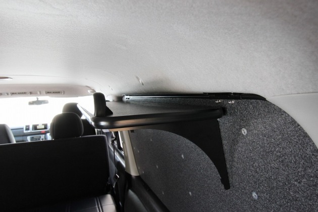 NV350キャラバン、200系ハイエース用に販売しているESウィンドウパネル。その、パネル内にM6ナットが埋め込まれているESウィンドウパネル(ナット有)を車輛に取り付けること紹介させていただくESフラットトレーを取り付けることができます。
