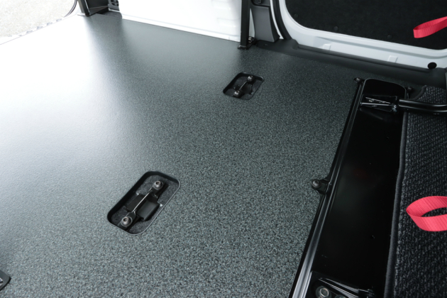 車内のフロアには、コンプリートカー専用のフロアパネルを設置しデコボコのないフラットな床に仕上がっています。