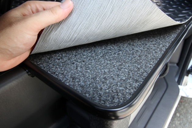 施工させていただいた、ハイエースのフロアはガレージのような縞鋼板柄の床で仕上げました。