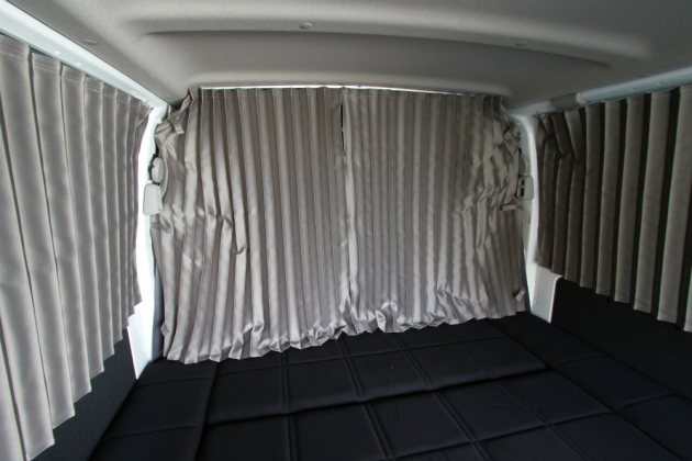 今回の施工では、特注でセカンドシートの後ろにカーテンを取付けました。