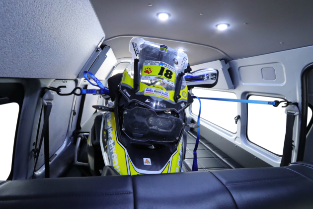 200kgオーバーのBMW R1200GSをハイエースの車内に固定するために取付けたのは、シートベルト用のボルトを利用したフックです。
