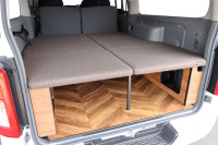フルサイズオフロードバイクを載せるときには、片側のベッドマットを取り外すことでバイクを載せつつ車中泊できるようになっています。