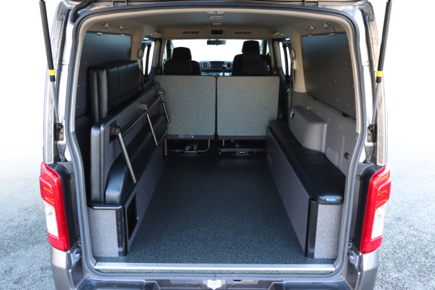 NV350キャラバンに取付けているのは、SHシングルフリップベッドをベースに特注で製作したベッドです。